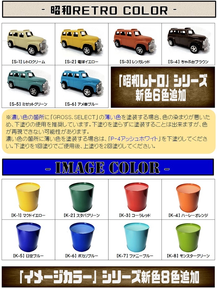 「MAT.SELECT」カラーサンプル (色見本)10色セットgselect 自動車塗装用艶消し塗料 1,3 円 送料無料 13ポイント (1倍) ペイントアシストラッキー 「MAT.SELECT」カラーサンプル (色見本)5色セットgselect 自動車塗装用艶消し塗料 770 円 送料無料 7ポイント (1倍) ペイントアシストラッキー 送料無料模型車 モデルカー トヨタカローラスポーツパワータイプカラーサンプ車の全塗装OK・水性塗料 カーペイント「Dippin' Paint 車塗料」。刷毛やローラーで自分の車、自転車、バイク、ガレージのシャッターなどをリメイク。マットでレトロなカラーを集めました。自分で車や自転車を手軽に安く塗り替えられるDIY塗料です。塗料・塗装用品・frp資材の総合ショップ 合資会社 小野塗料店 営業時間: 平日‐800 ~ 1700 土曜‐800 ~ 10 休業日: 第2,第4土曜 日曜 祝日